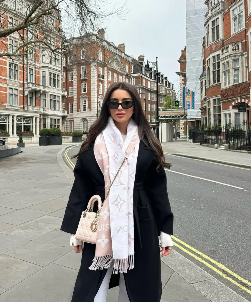 The soft blush Louis Vuitton scarf adds a feminine touch, while the matching quilted handbag ties the look together with subtle sophistication.
