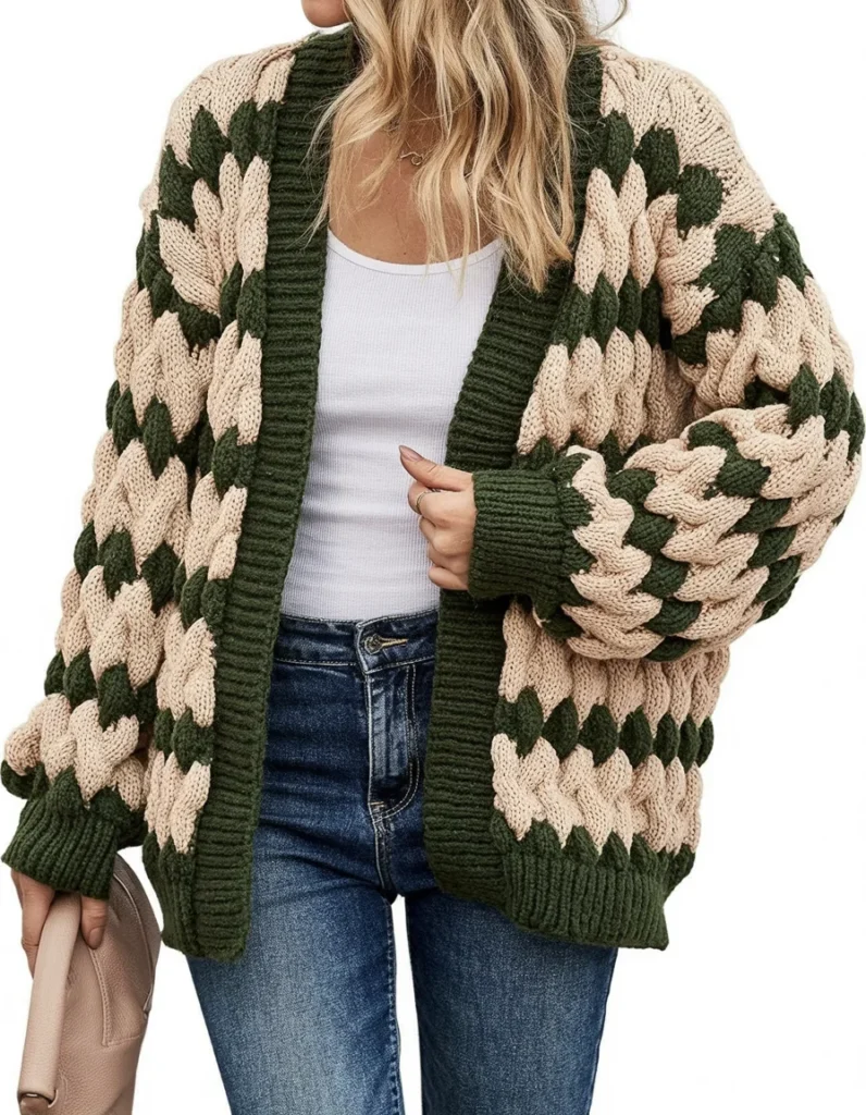 This chunky knit cardigan adds warmth and character to any winter outfit. Featuring earthy green and beige tones, it brings a cozy, rustic charm that pairs beautifully with denim or a simple white tee.