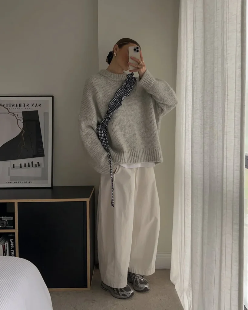 This cozy winter outfit blends simplicity with a relaxed, modern touch. The oversized grey knit sweater brings warmth and softness, while the wide cream trousers add flow and ease to the silhouette.