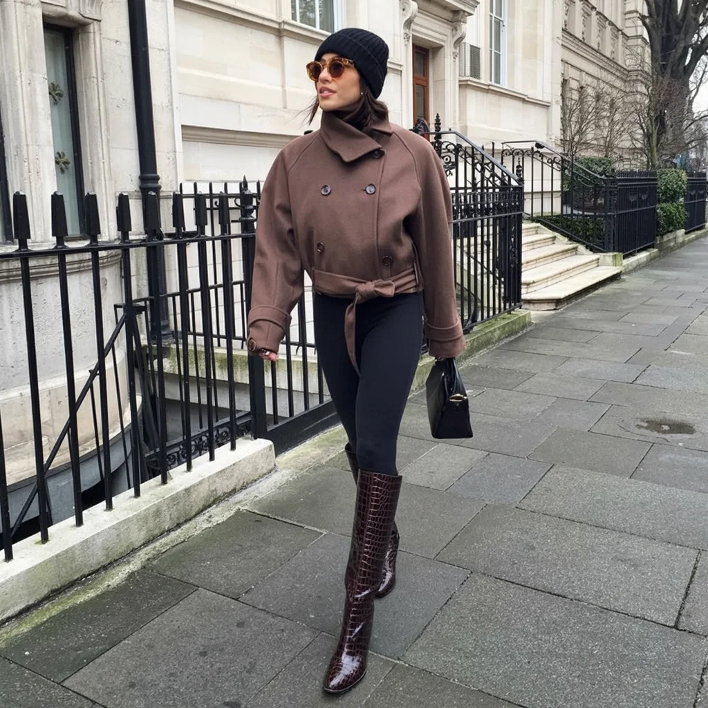 A cropped chocolate-brown coat paired with sleek black leggings sets a bold yet elegant tone for winter dressing.