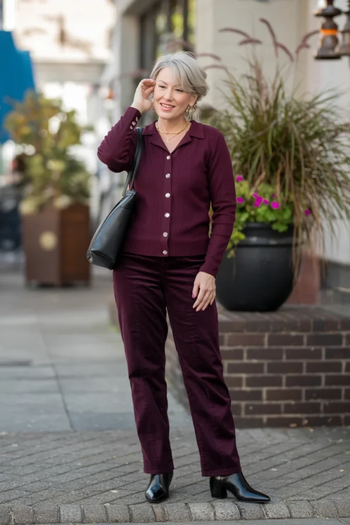 This burgundy outfit blends warmth and sophistication in one timeless look. The ribbed button-down sweater pairs effortlessly with soft corduroy pants, creating a cozy texture contrast that feels both stylish and comfortable.