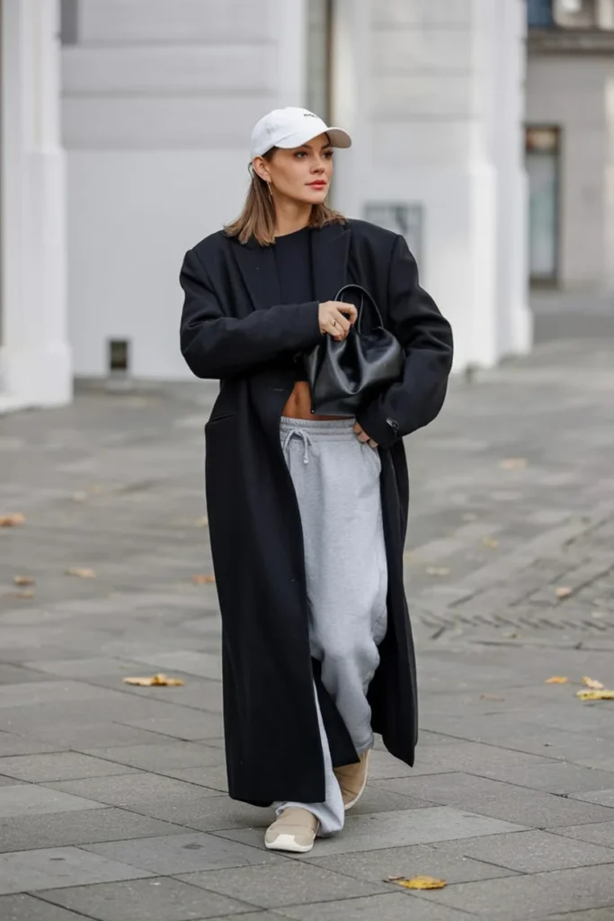 An oversized black coat layered over a cropped sweatshirt and soft grey joggers creates a cozy yet modern winter outfit.