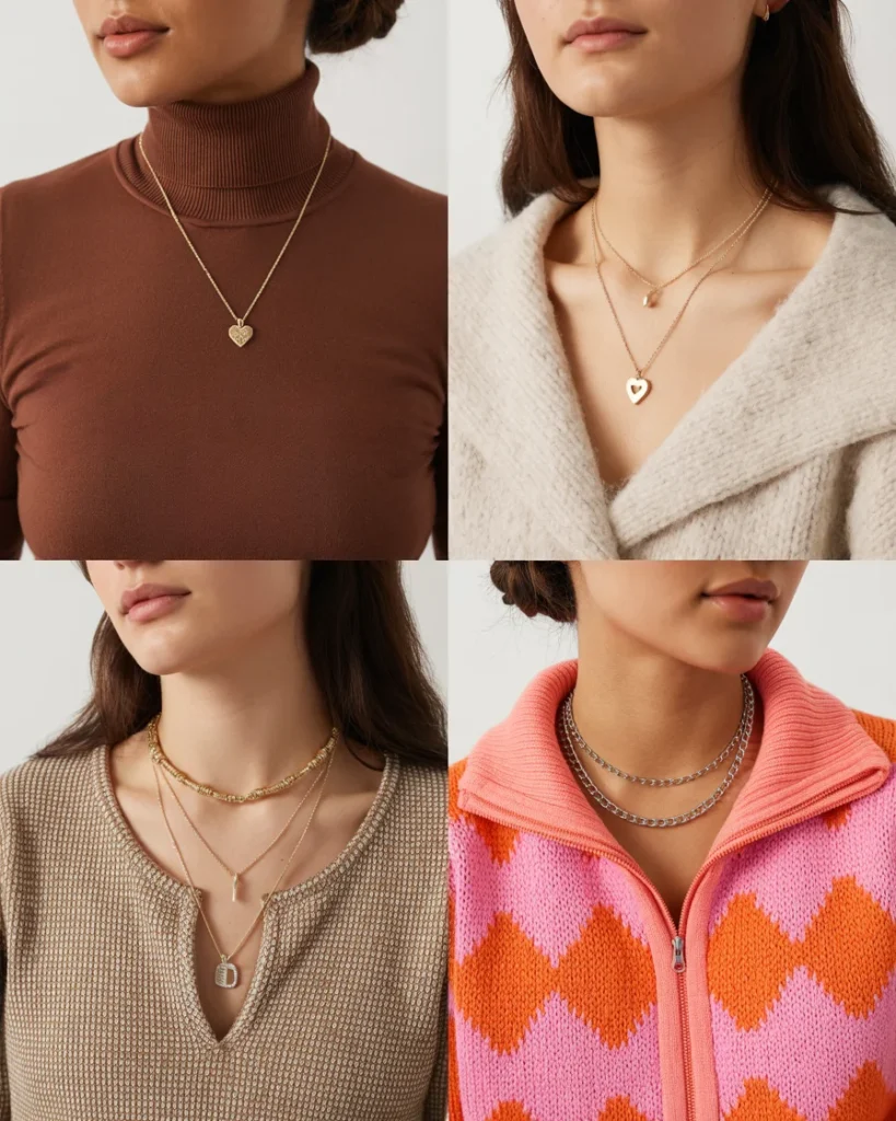 These elegant layered necklaces bring warmth and shine to cozy winter outfits. Each look tells its own story , from the classic gold heart pendant that complements a rich turtleneck, to the dainty layered chains that add charm to soft knits.