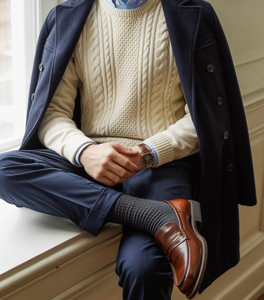 The tailored navy trousers complement the outfit’s sleek lines, offering a refined silhouette. Brown leather loafers and grey striped socks provide a subtle contrast, elevating the outfit with a touch of luxury.