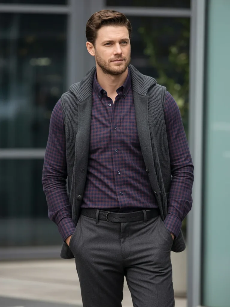 This winter outfit strikes the right balance between smart and comfortable. A rich plaid shirt adds visual interest while the knitted vest provides extra warmth and texture, creating a layered effect without being too bulky.