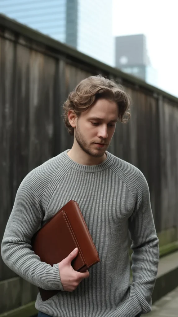 The texture of the knit adds depth, enhancing the outfit’s overall appeal. Holding a brown leather portfolio, the man complements the look with sophisticated accessories, combining practicality with style.