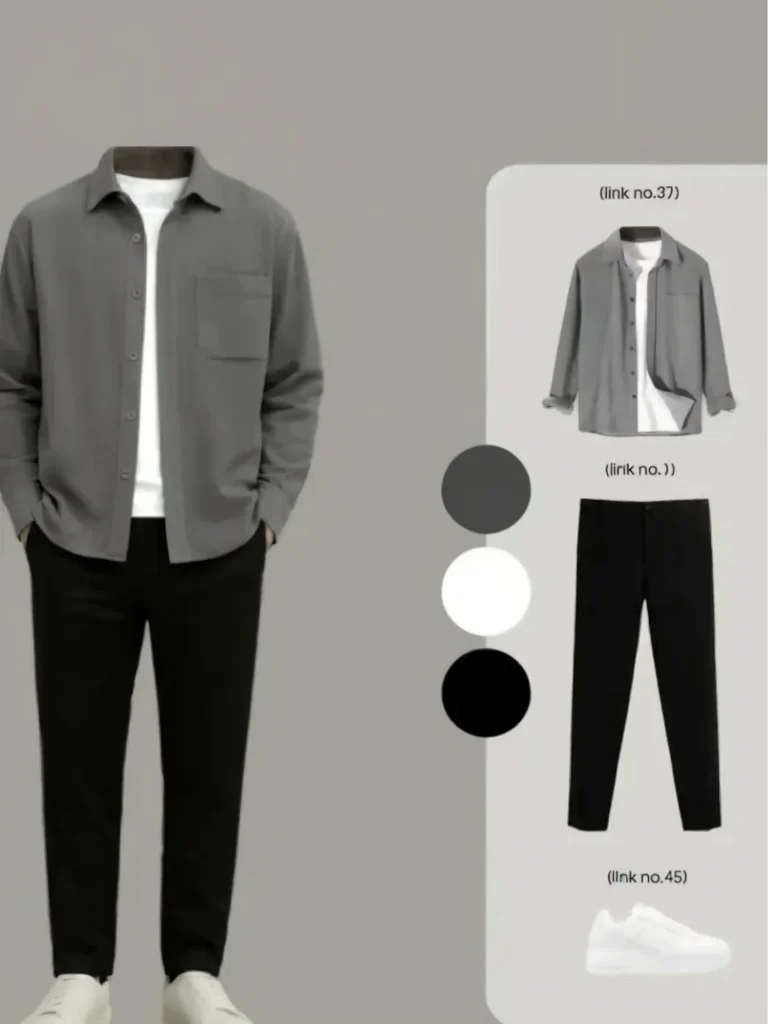 The background’s urban vibe mirrors the casual yet refined nature of the outfit. This ensemble is perfect for a day out, offering comfort and style without overcomplicating things.