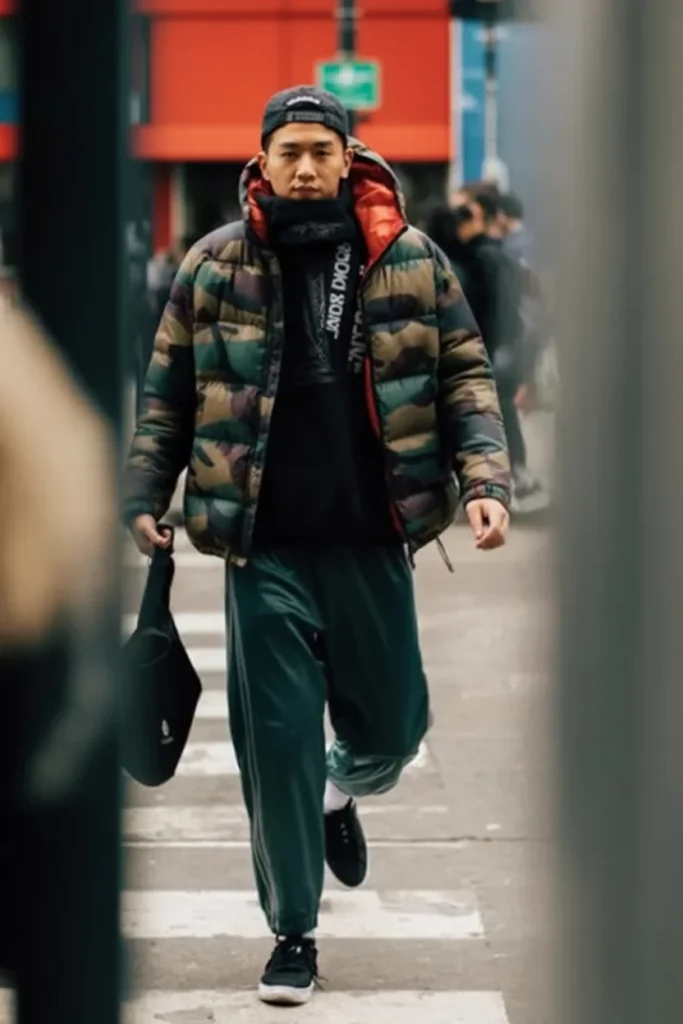 This winter outfit blends comfort and urban style effortlessly. A camouflage puffer jacket provides both warmth and a bold look, perfect for colder days.
