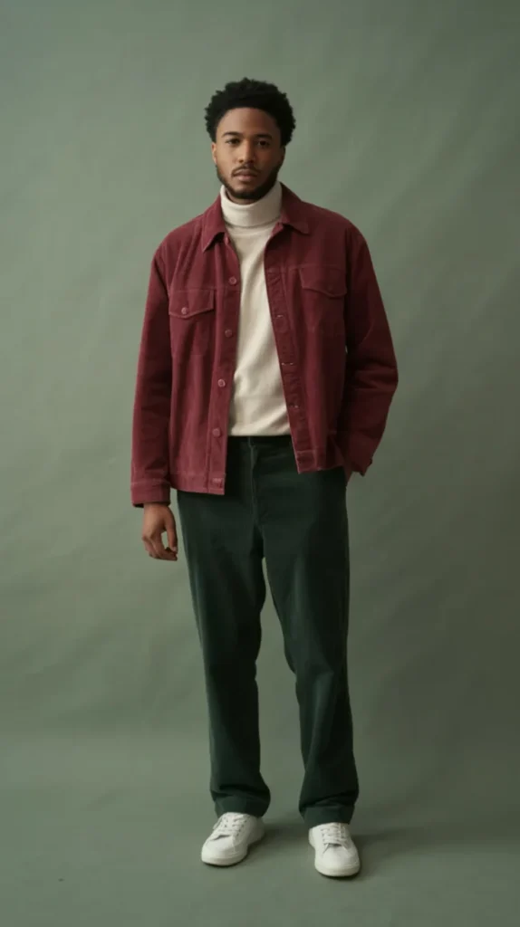 This winter ensemble blends comfort with modern style effortlessly. A rich burgundy corduroy jacket adds warmth and texture, creating a bold contrast against the simple white turtleneck underneath.