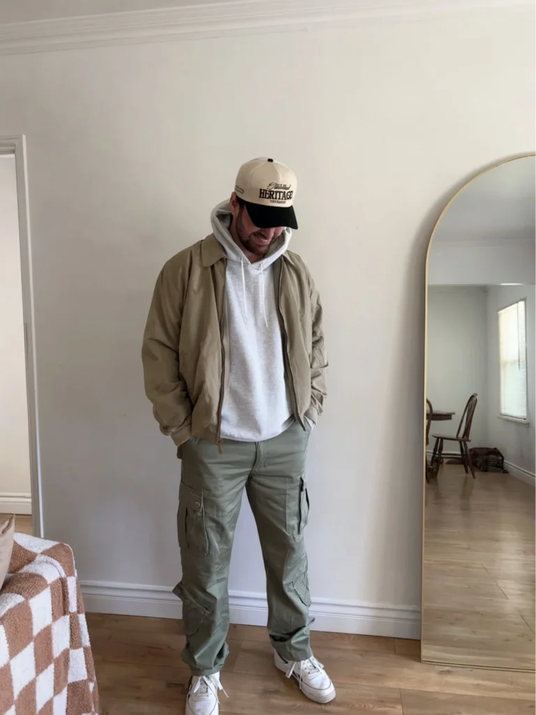 Olive cargo pants give the look a practical edge, with ample pockets for convenience. Pairing the outfit with classic white sneakers keeps it grounded and versatile.