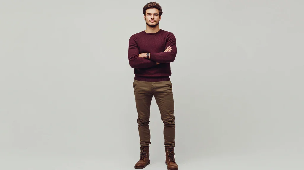 This winter outfit strikes a balance between warmth and casual style. A deep burgundy sweater brings richness to the look while providing comfort for colder days.