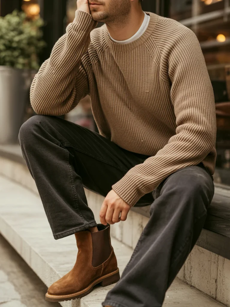 The dark denim trousers offer a slightly tapered fit, balancing out the sweater’s bulk with sleek lines. Suede brown Chelsea boots not only provide added warmth but also elevate the overall look with their sophisticated yet casual appeal.