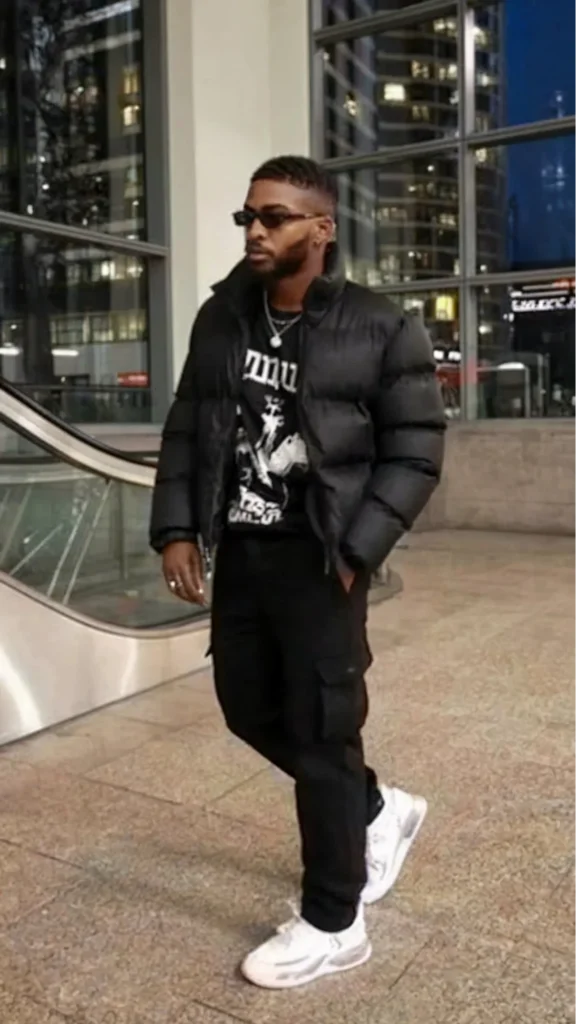 This winter look combines warmth and streetwear style with ease. A puffy black jacket provides the necessary insulation against the cold, offering both comfort and style. The graphic t-shirt adds a touch of personality, showcasing an urban vibe.