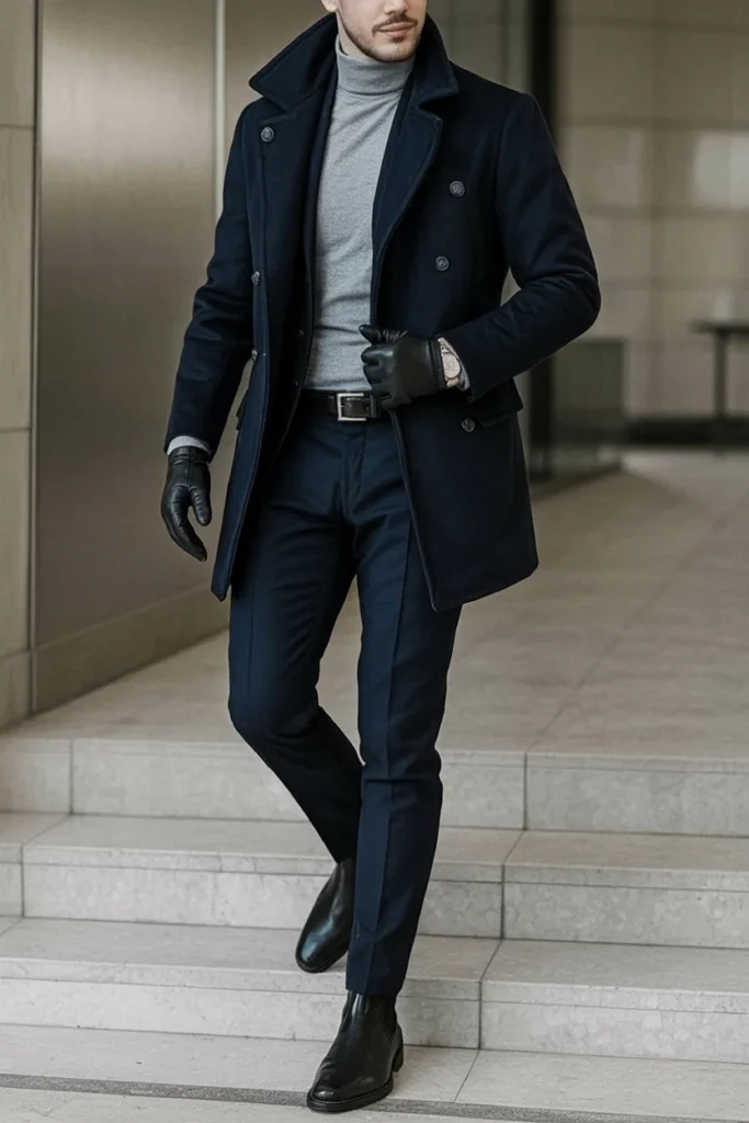This winter outfit for men exudes sophistication with its refined and stylish layers. A dark navy peacoat offers both warmth and a sleek silhouette, perfect for colder days.