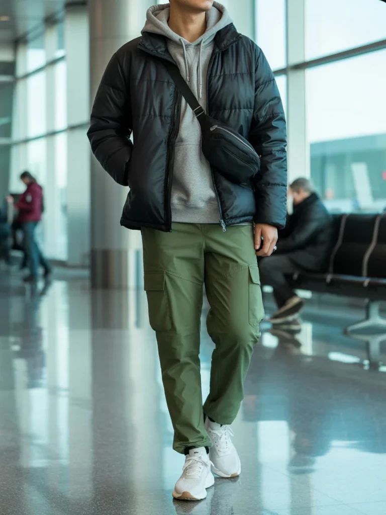 Pairing it with cargo pants enhances the functional aspect, while the sleek black sneakers keep the look grounded.