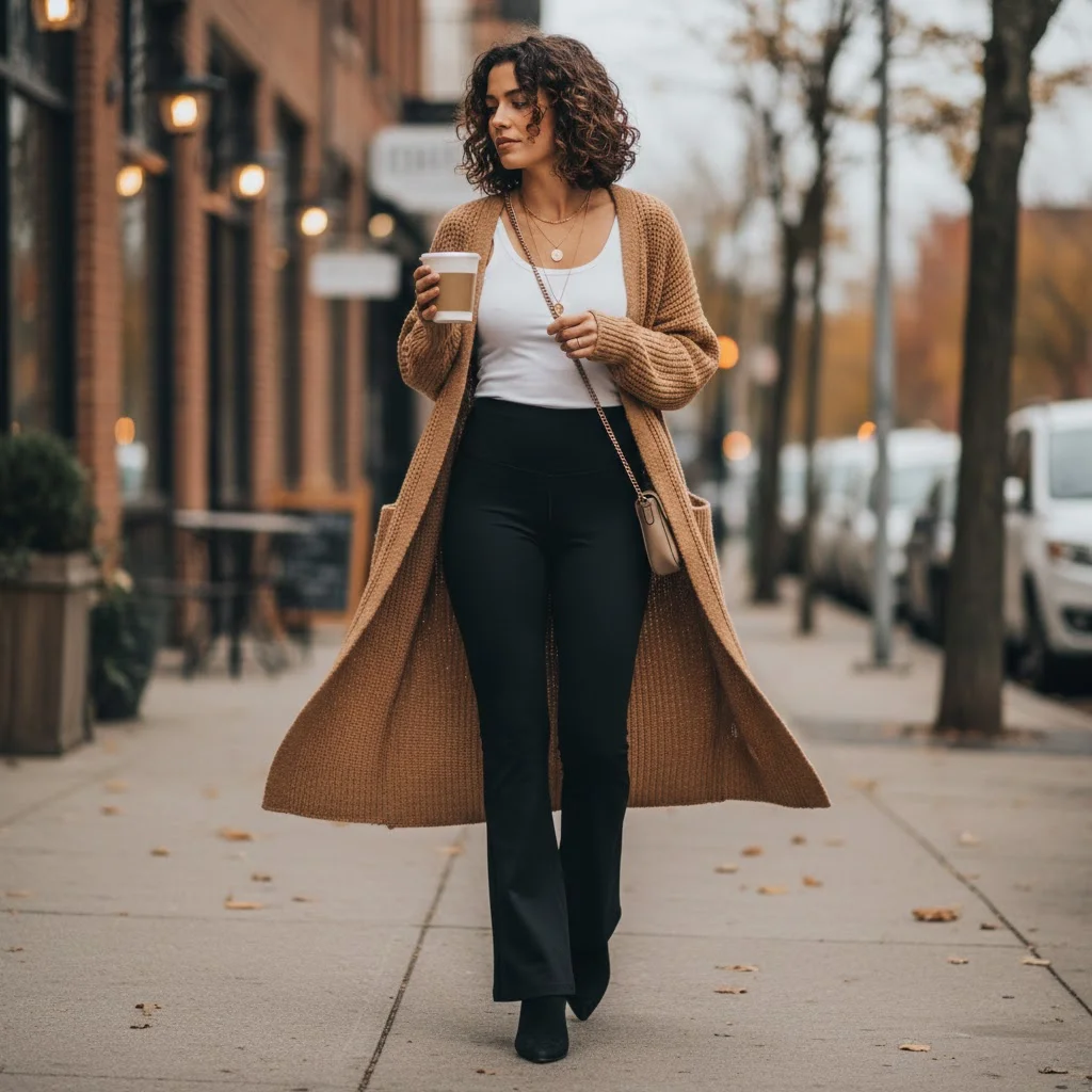 If you’re looking for a more elevated yet cozy look, pairing your yoga pants with a long cardigan is a great choice. The long cardigan adds a layer of sophistication while keeping you cozy. This outfit is perfect for colder months or those days when you want something comfy but still put-together.