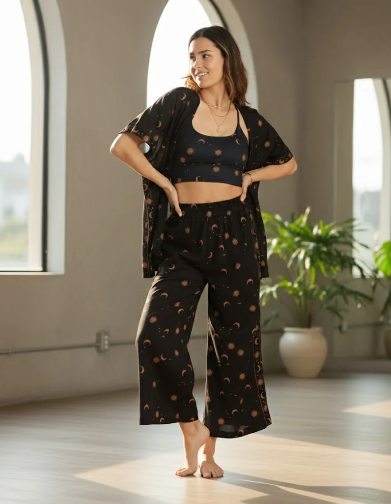 A flowy kimono paired with a matching patterned yoga set is a chic and comfortable option for both practice and lounging. This combination adds a relaxed, bohemian vibe to your workout attire.