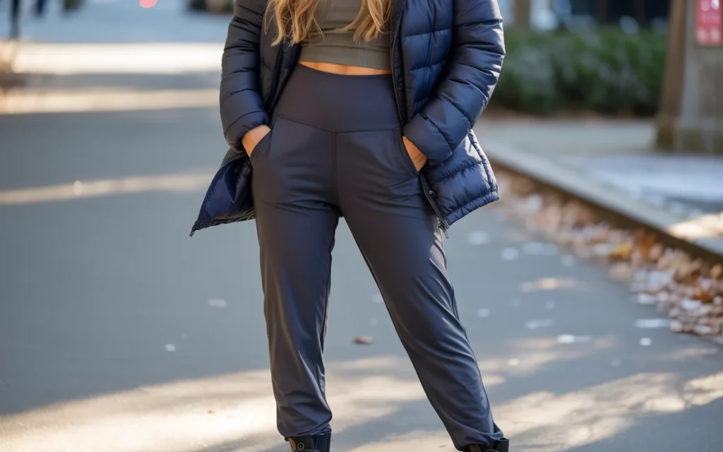 For colder months, pairing yoga pants with a puffer jacket creates a warm and stylish look. This outfit keeps you cozy while still looking put-together, ideal for running errands or meeting up with friends.