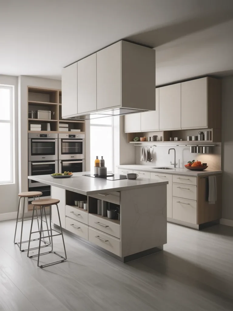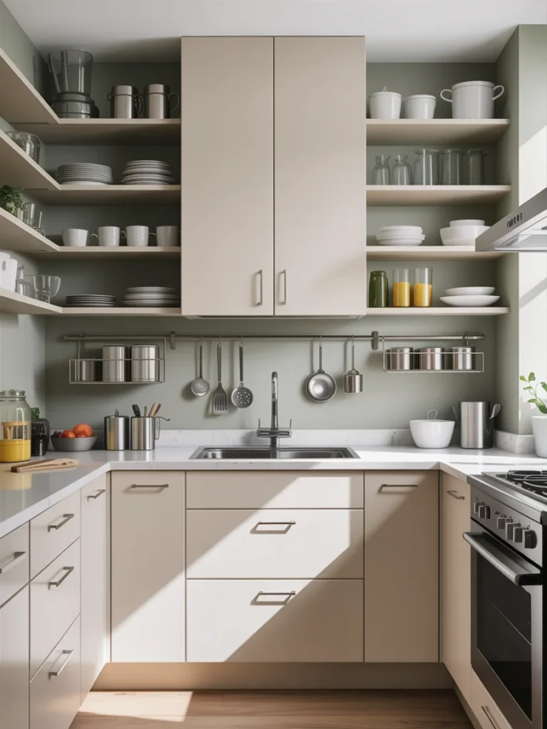 When floor space is limited, going vertical is key. Installing tall cabinets, hanging racks, and shelving units along the walls helps free up counter space while offering extra storage for kitchen essentials.