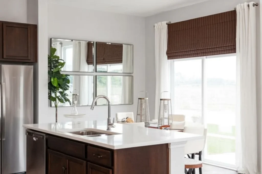 This kitchen blends sleek, dark wood cabinetry with a bright, clean countertop and backsplash, creating a balanced and modern aesthetic. The mirrored wall panels and ample natural light enhance the sense of openness, while the minimalistic accessories and plants add a touch of freshness to the space. Perfect for a light-filled, contemporary home.