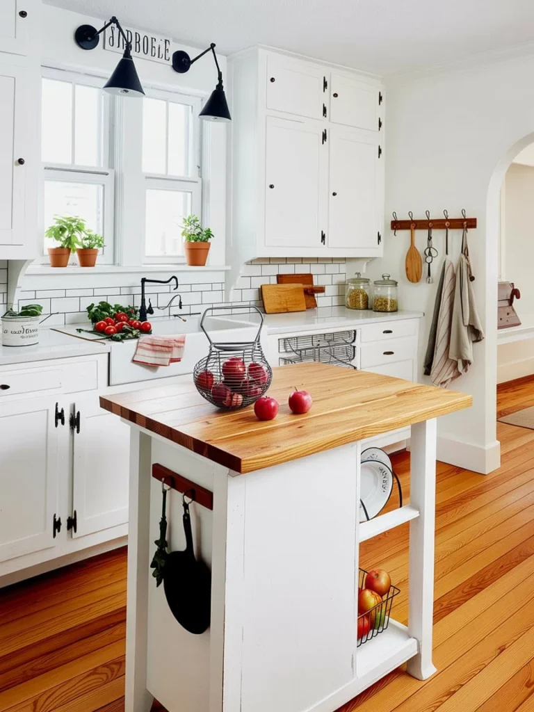 This cozy, farmhouse-inspired kitchen features bright white cabinetry, sleek subway tiles, and rustic wooden accents. The wooden island adds warmth, while the hanging lights and plants create a welcoming, fresh vibe. The layout maximizes natural light, offering both function and charm.