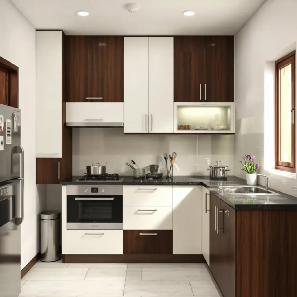This modern kitchen combines rich wood tones with sleek white cabinets, offering a clean and elegant contrast. The compact layout maximizes space while providing ample storage and functionality. The subtle under-cabinet lighting adds warmth, enhancing the overall design and creating a bright, inviting atmosphere.