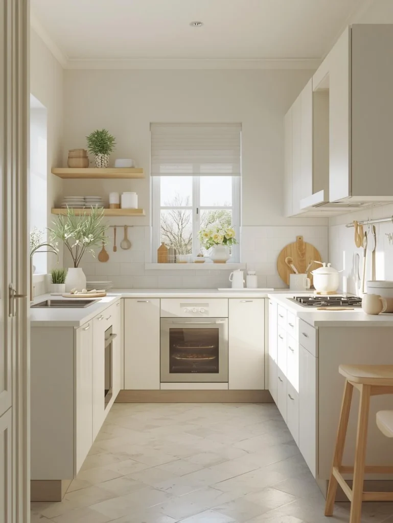Incorporating light colors into your kitchen layout helps make a small space feel bigger and brighter. Soft whites, pastel shades, and light wood finishes create a clean, open feel, making your kitchen look and feel more spacious.