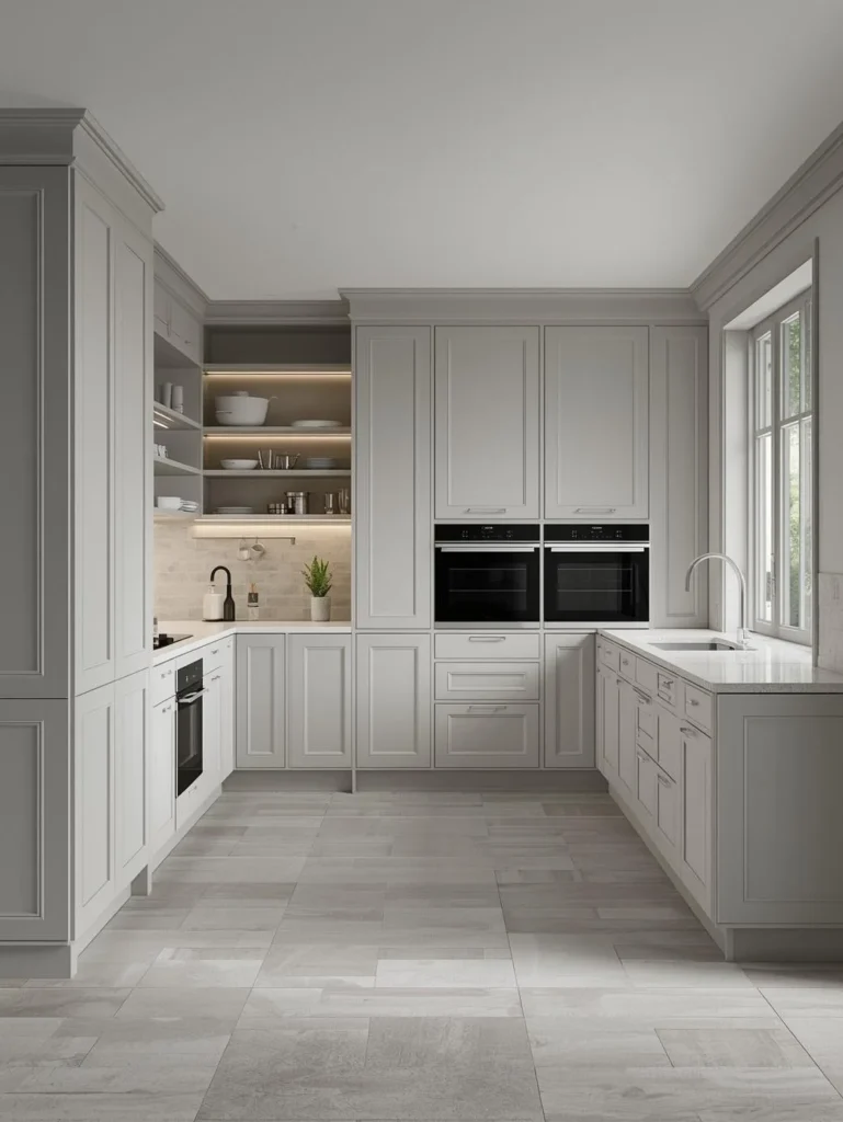 The U-shaped layout makes use of three walls, providing ample countertop space and storage. This design is perfect for small kitchens as it maximizes storage while maintaining a functional workspace. It’s efficient and ideal for corner areas.