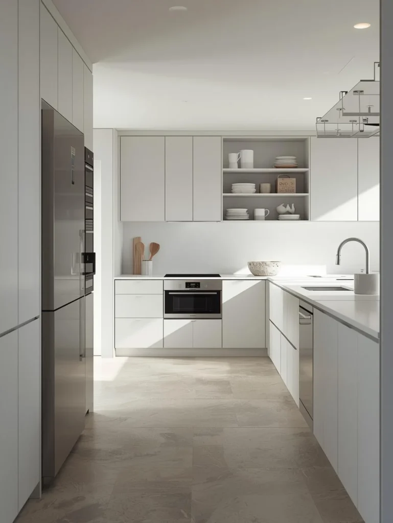Sleek lines and clean surfaces define minimalist kitchens. This layout focuses on simplicity and functionality, with a focus on efficient storage, hidden appliances, and uncluttered counters. It’s a perfect fit for small kitchens that need to feel airy and open.