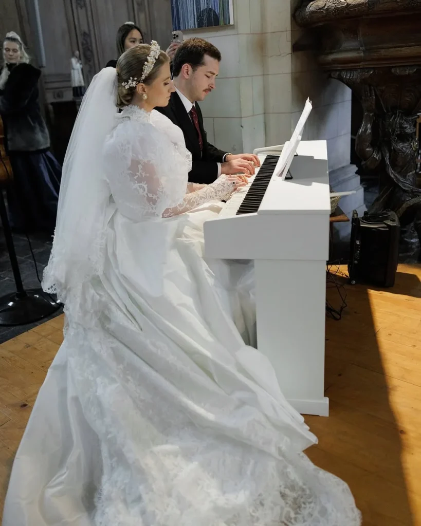 Soft pleats flow from the waist, adding movement and elegance as the bride walks or sits, as seen in this heartwarming piano moment. The sheer lace adds a delicate contrast against the structured satin, making it a breathtaking blend of texture and refinement. Brides who dream of a classic church ceremony or royal-inspired wedding will find this gown a true reflection of elegance that never fades.