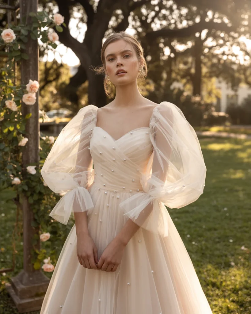 The gathered tulle at the wrists adds a dreamy, whimsical touch that feels both modern and vintage. Every detail,from the soft draping to the scattered pearls,evokes a fairytale moment. This dress speaks to brides who love elegance with a hint of innocence and wish to look effortlessly radiant as they walk through sunlit aisles or blooming gardens.