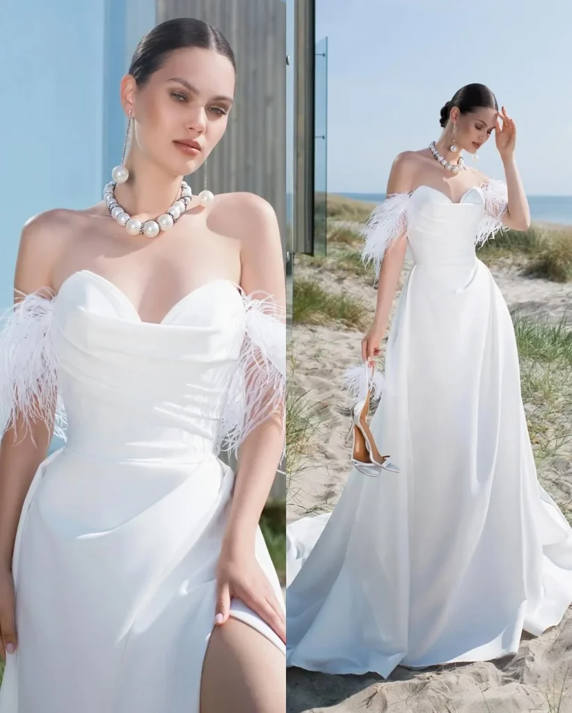 2. Off-Shoulder Feathered Satin Wedding Gown