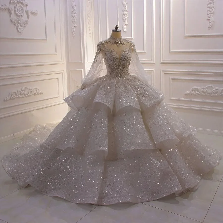 Fit for a fairytale moment, this glittering ball gown brings grandeur to life. The cascading layers of shimmering fabric create a regal silhouette that glows with every step. Its sheer sleeves and beaded bodice add just the right amount of romance, blending classic luxury with modern artistry. The intricate embellishments sparkle subtly under the light, making it a breathtaking choice for brides who dream of a royal entrance.