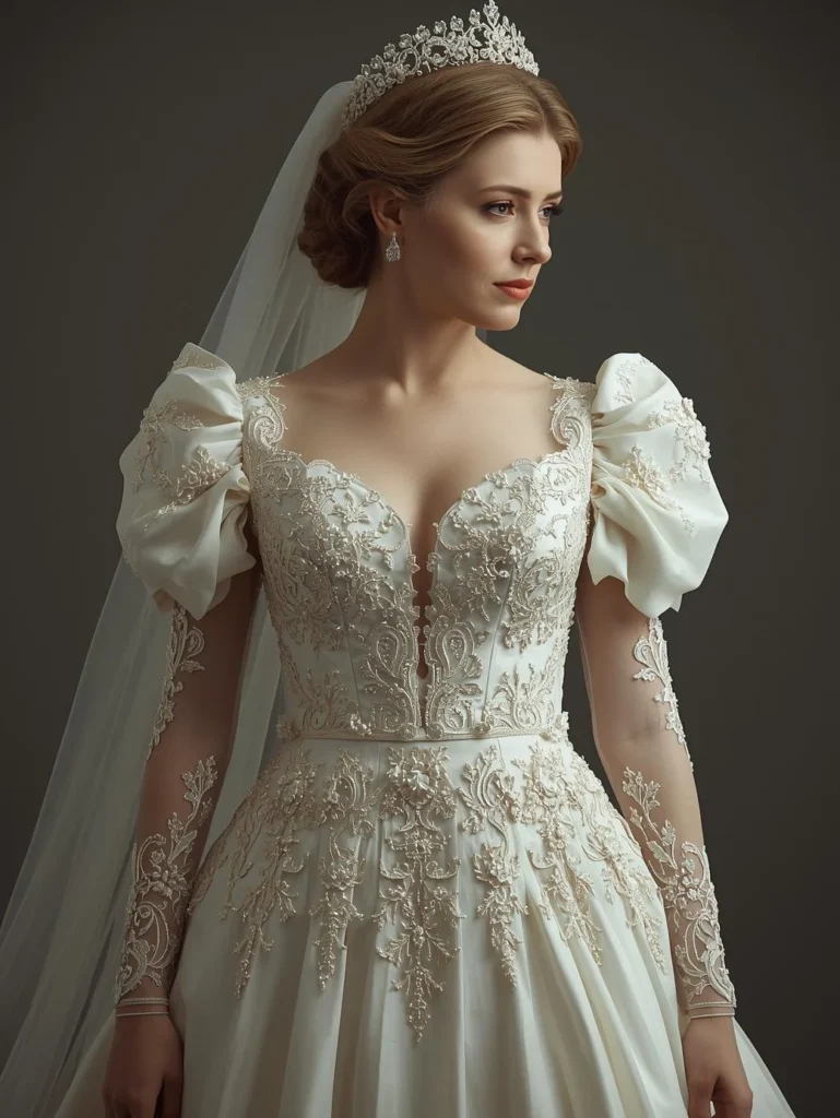 This regal wedding gown celebrates timeless beauty through its luxurious design and craftsmanship. The structured puff sleeves add a touch of vintage charm, balanced by sheer embroidered panels that create an air of delicate sophistication. Intricate lace embroidery flows from the bodice to the skirt, telling a story of elegance and romance in every stitch.