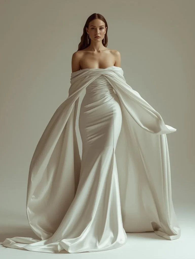 16. Satin Off-Shoulder Draped Gown with Flowing Sleeves
