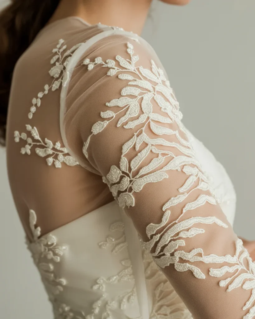 Soft and graceful, this wedding dress with sheer lace illusion sleeves captures timeless femininity. The delicate floral embroidery glides across the transparent fabric, creating an ethereal touch that feels both modern and classic. Each thread tells a story of craftsmanship, with intricate lace vines tracing the arm in exquisite detail.