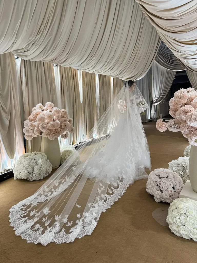A cathedral-length veil drapes elegantly over the shoulders, completing the look with a soft, dreamy aura. The sheer sleeves and high neckline bring a touch of sophistication, while the floral lace pattern adds texture and depth.