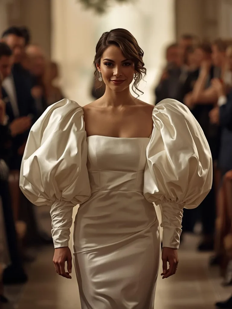 Bold yet romantic, this satin puff sleeve gown brings a modern twist to timeless bridal elegance. The voluminous sleeves add a touch of drama, creating a stunning balance with the sleek, figure-hugging silhouette.