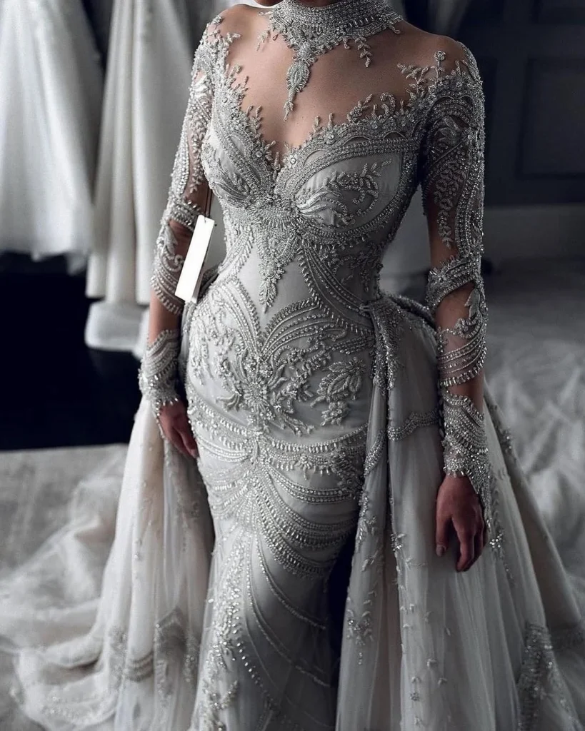This gown is a masterpiece of craftsmanship, shimmering with thousands of hand-sewn beads that trace every curve with precision and artistry. The illusion neckline and sleeves add a touch of mystique, blending seamlessly into the skin for a sculpted, ethereal effect. Each bead and embroidery pattern creates a sense of movement, making the gown feel alive under soft light.