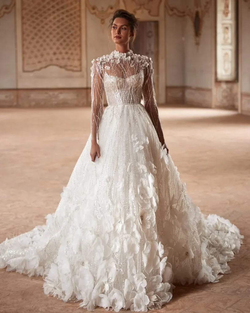 A winter wonderland wedding deserves a gown as magical as this. This lace masterpiece features long sleeves and intricate floral embroidery that glisten softly beneath the falling snow. The voluminous train adds drama, while the fitted bodice enhances the bride’s natural grace.