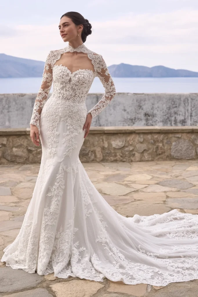 Every element of this gown speaks to quiet confidence and natural beauty, making it one of the most charming wedding dresses with sleeves this season.