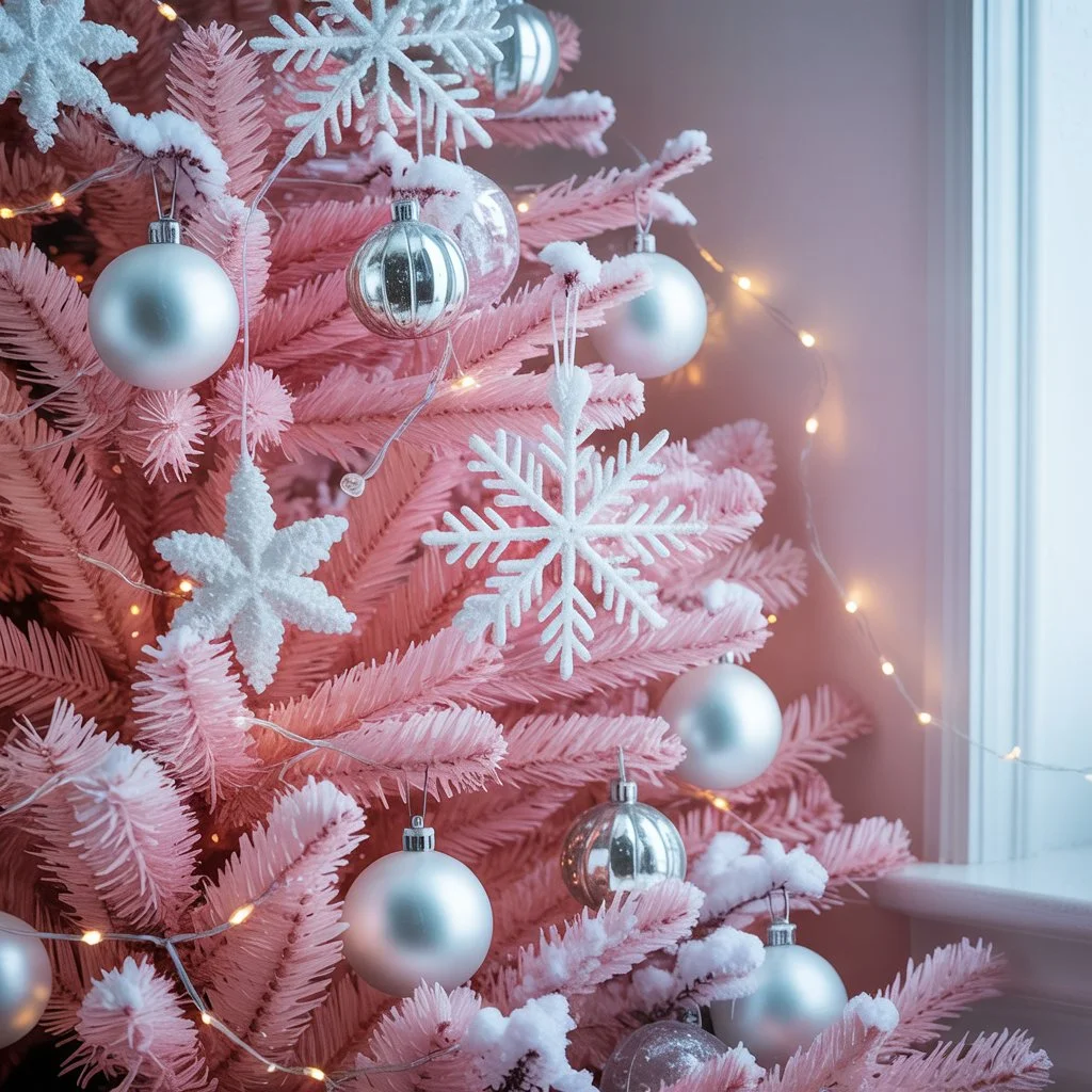 This look transforms your tree into a snowy masterpiece that feels peaceful and magical, like a pink forest blanketed in snow.