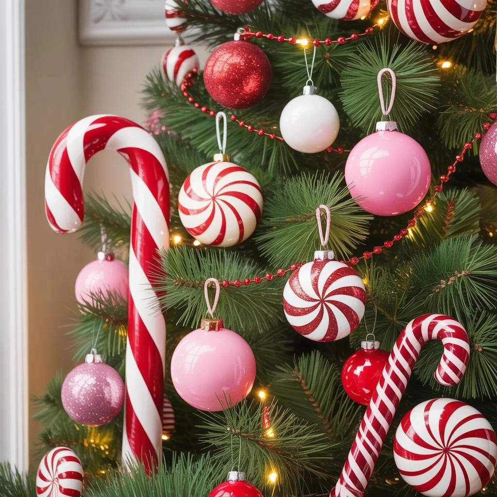 For a playful and nostalgic holiday look, try a candy cane theme. Mix pink, red, and white ornaments with striped ribbons, faux candy canes, and lollipop decorations.