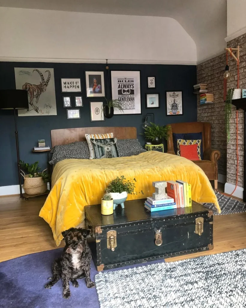 This bedroom blends mid-century modern charm with an eclectic personality that feels lived-in and full of soul. The deep navy wall creates a striking backdrop, allowing the warm wood tones of the furniture and the pops of yellow to stand out beautifully.