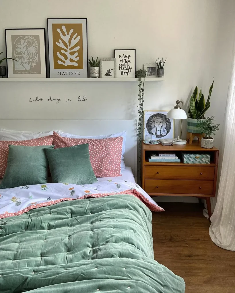 Above the headboard, Matisse-inspired wall art and uplifting quotes add a creative and joyful touch. Each detail, from the trailing plants to the retro lamp, complements the design’s natural charm.