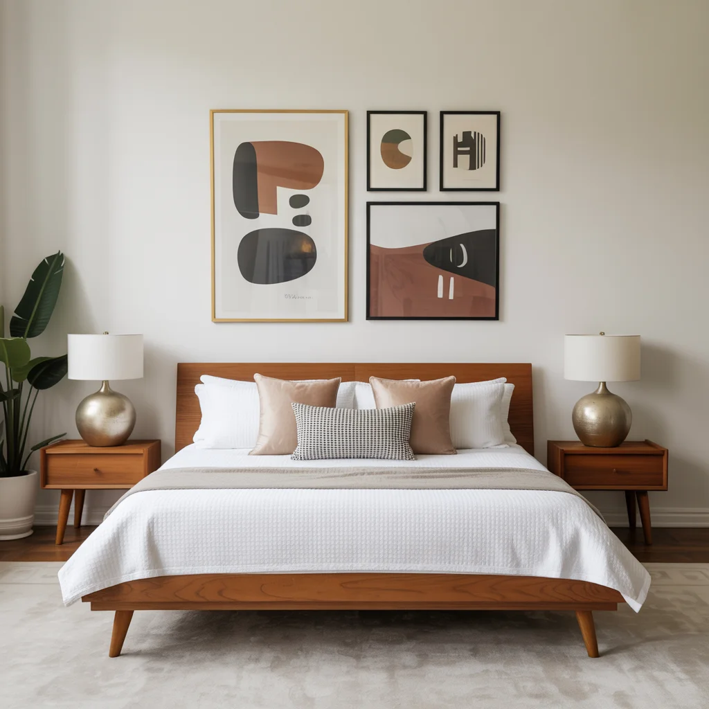 Soft tones and playful prints come together beautifully in this mid-century modern bedroom, creating a cozy yet artistic vibe. The warm wood nightstand and clean white headboard offer a classic foundation that anchors the room with balance and simplicity.