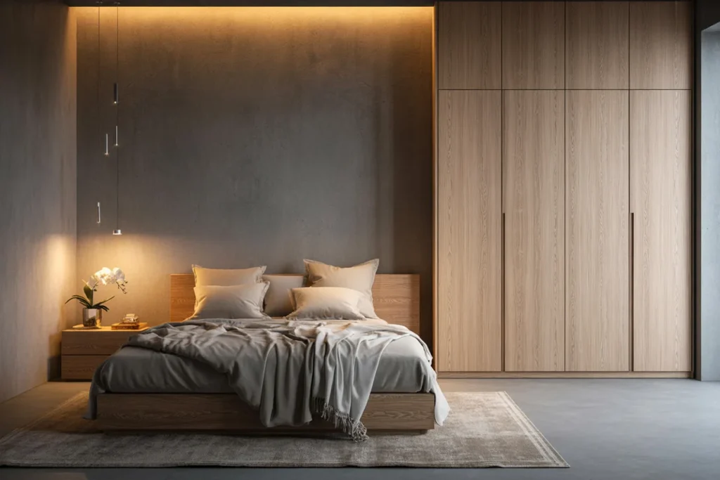 Soft neutral bedding blends beautifully with the warm tones of the wood, creating a harmonious balance. The textured area rug and modern lounge chair complete the cozy composition.
