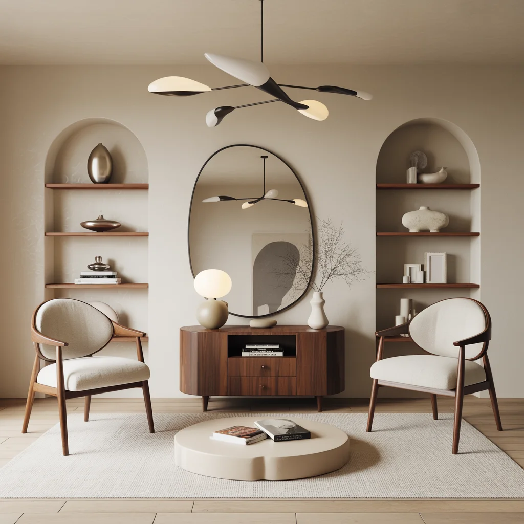 Mid-century design often blends functionality with organic forms inspired by nature. Introduce curved furniture and decor pieces such as rounded mirrors, oval nightstands, or arched lamps.