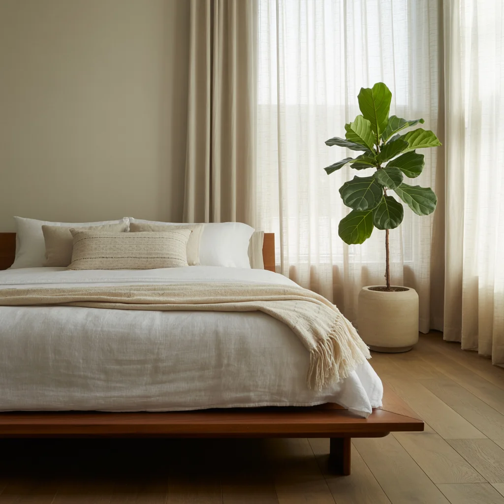 This setup captures the beauty of simplicity,  where light, texture, and thoughtful design come together to form a truly tranquil space for rest and reflection.