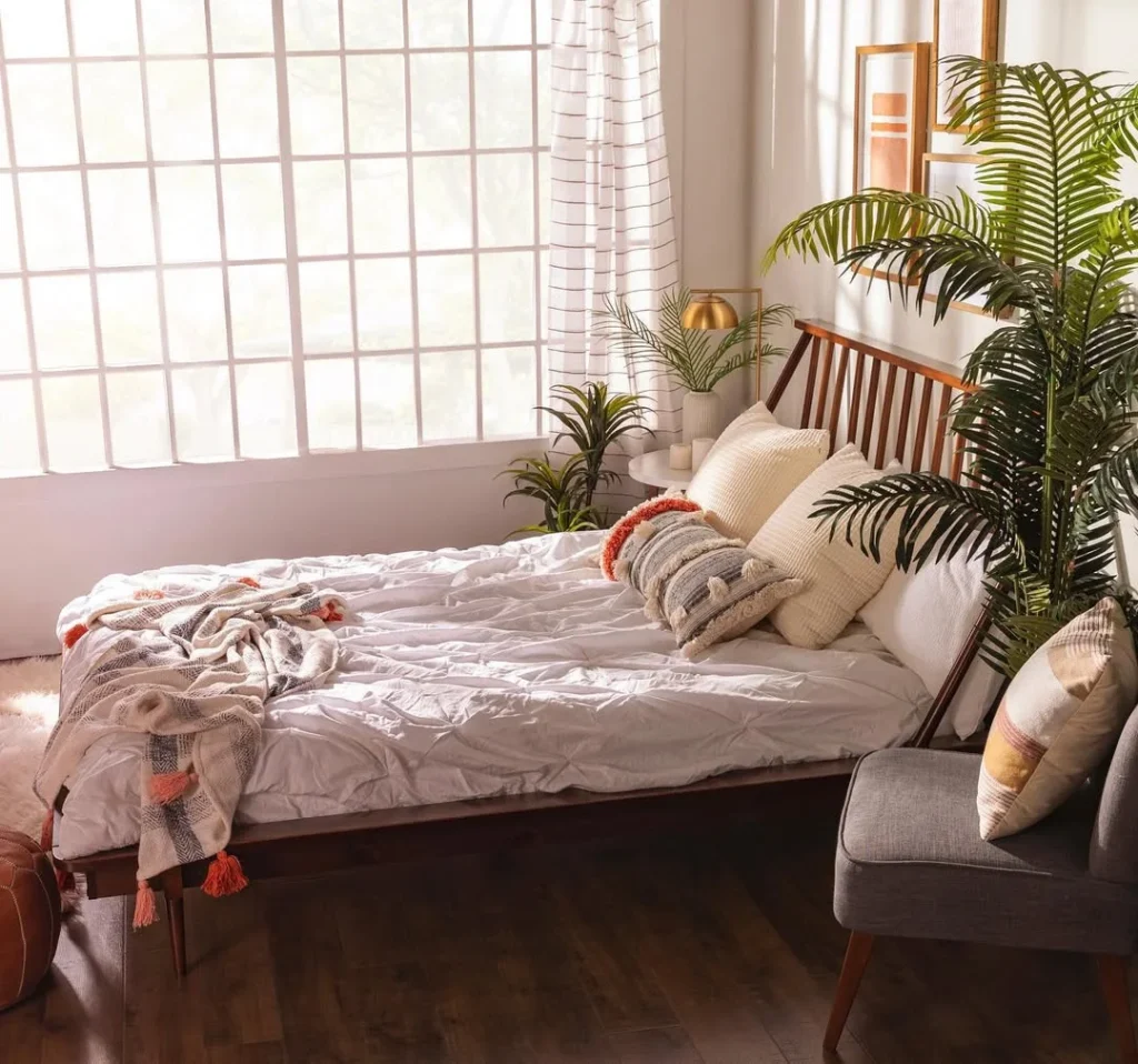 A sleek wooden bed frame with slanted spindles adds timeless charm, while the white bedding keeps the look fresh and uncluttered. Textured throw pillows and a tasseled blanket bring warmth and a cozy touch that softens the clean lines of the furniture.